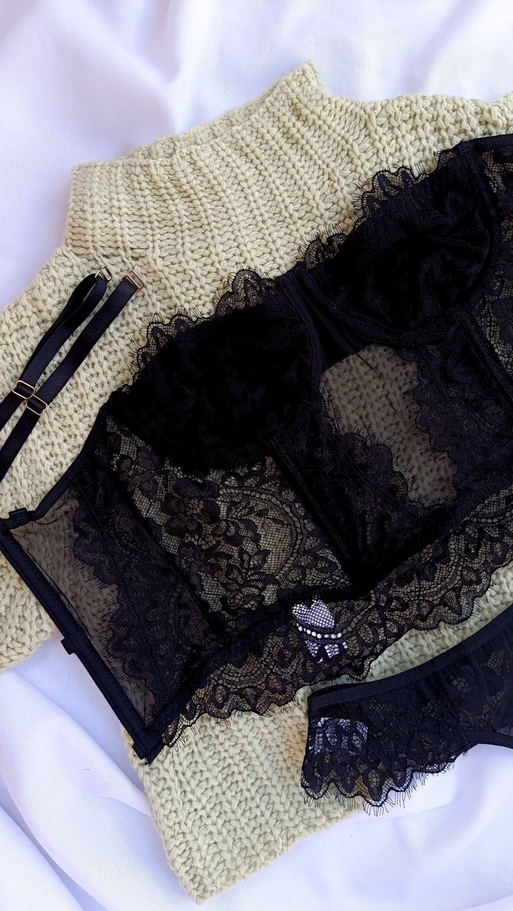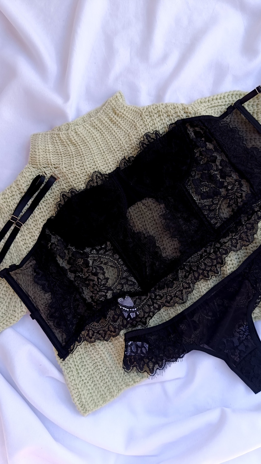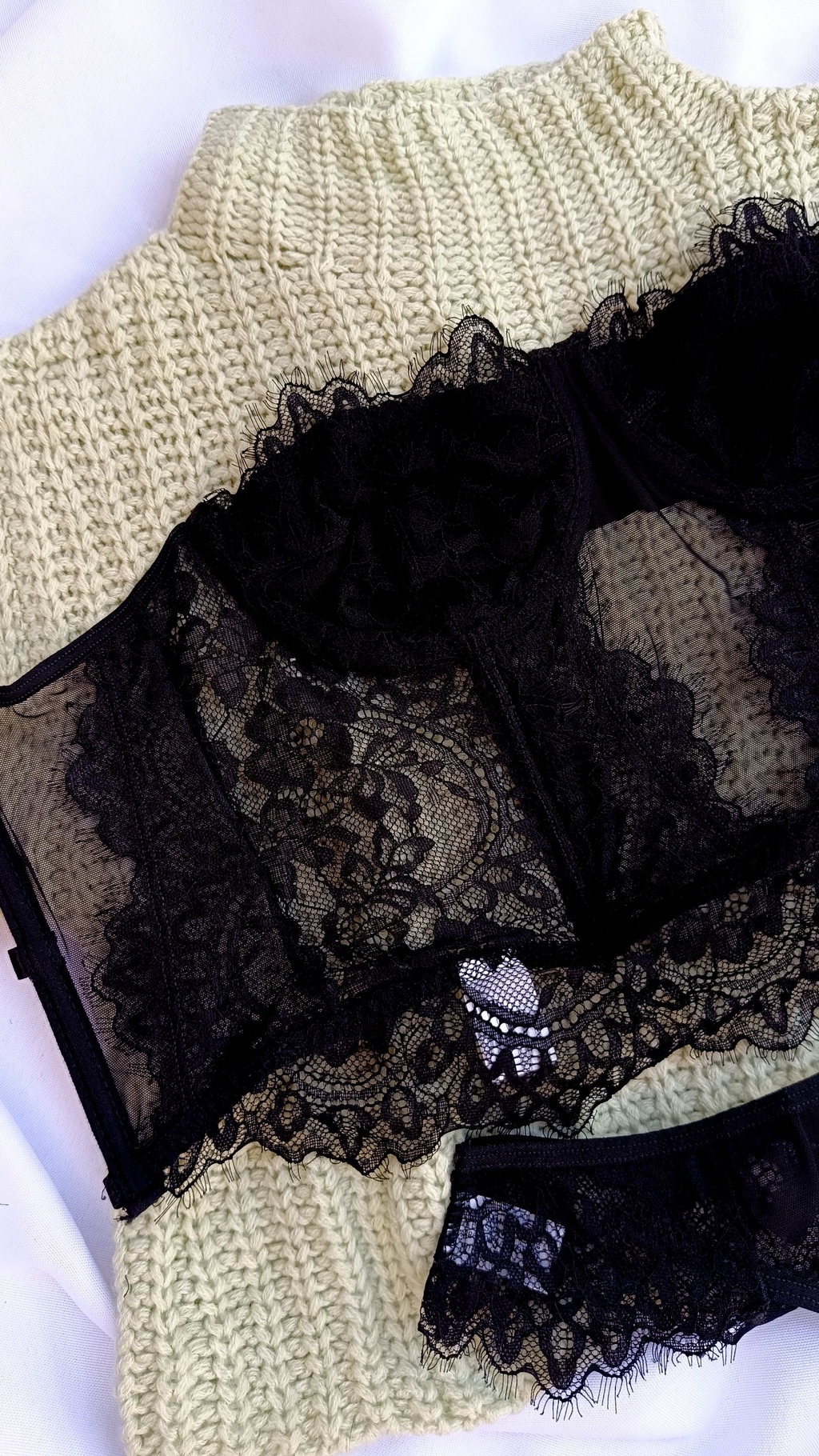 Conjunto Dani em renda chantilly e tule sem bojo e com aro, acompanha alças removíveis e paletas de sustentação, calcinha toda em renda.
